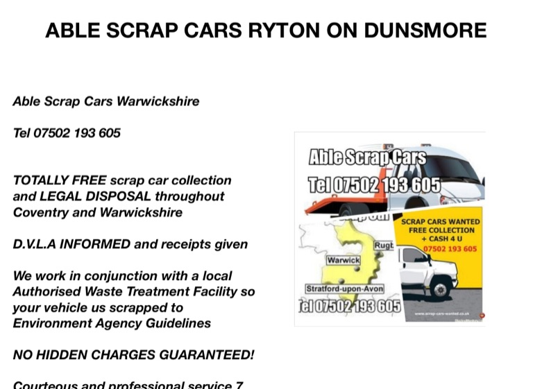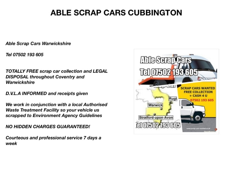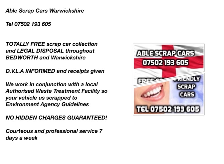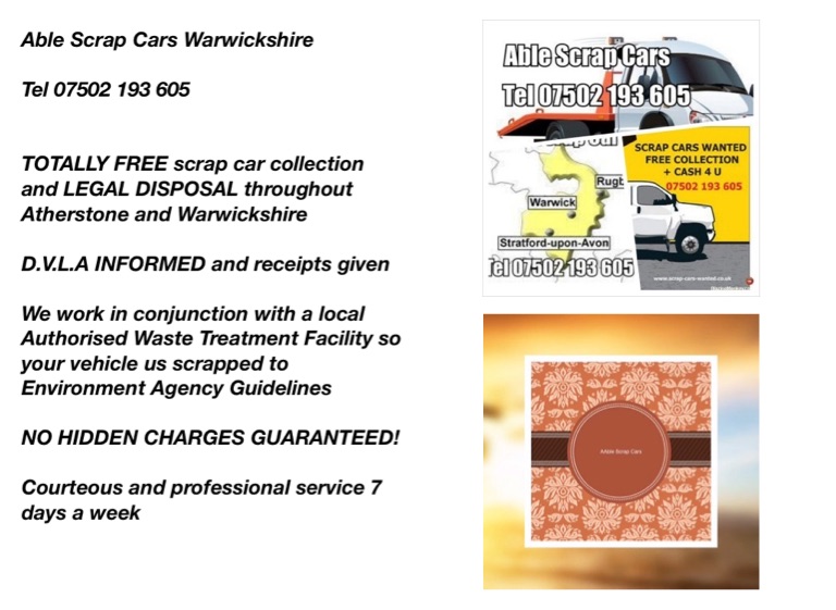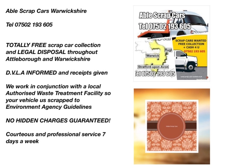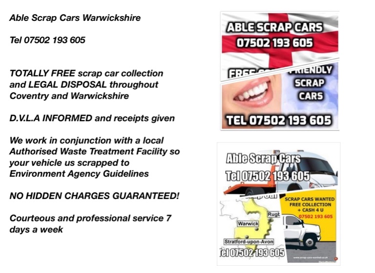 Able Scrap Cars Warwickshire Tel 07502 193 605 TOTALLY FREE scrap car collection and LEGAL DISPOSAL throughout Coventry and Warwickshire D.V.L.A INFORMED and receipts given We work in conjunction with a local Authorised Waste Treatment Facility so your vehicle us scrapped to Environment Agency Guidelines NO HIDDEN CHARGES GUARANTEED! Courteous and professional service 7 days a week Scrap/Old/Broke Down Car Disposal in Coventry Scrap/Old/Broke Down Car Disposal in Stratford upon Avon Scrap/Old/Broke Down Car Disposal in Leamington Spa Scrap/Old/Broke Down Car Disposal in Kenilworth Scrap/Old/Broke Down Car Disposal in Nuneaton Scrap/Old/Broke Down Car Disposal in Rugby Scrap/Old/Broke Down Car Disposal in Bedworth Scrap/Old/Broke Down Car Disposal in Henley in Arden