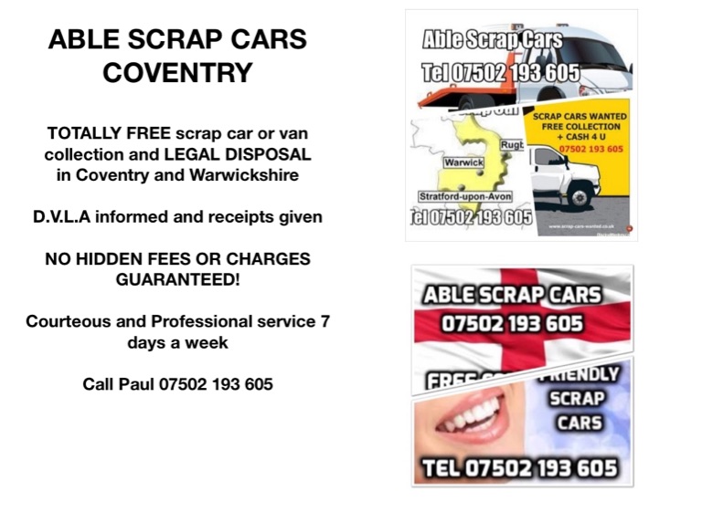 ABLE SCRAP CARS COVENTRY and WARWICKSHIRE Call Paul 07502 193 605 Fast, friendly, reliable and professional scrap car collection and disposal 7 days a week. CASH paid for cars in Coventry, Warwick, Stratford upon Avon, Leamington Spa, Kenilworth, Nuneaton, Bedworth, Rugby and ALL Warwickshire towns and villages. D.V.L.A informed and receipts given. ALL cars and vans taken off the road and recycled in an environmentally acceptable way. Call Paul 07502 193 605 scrap car companies in coventry, warwickshire, cash paid for cars in coventry, warwickshire OUR SERVICES IN COVENTRY AND WARWICKSHIRE INCLUDE