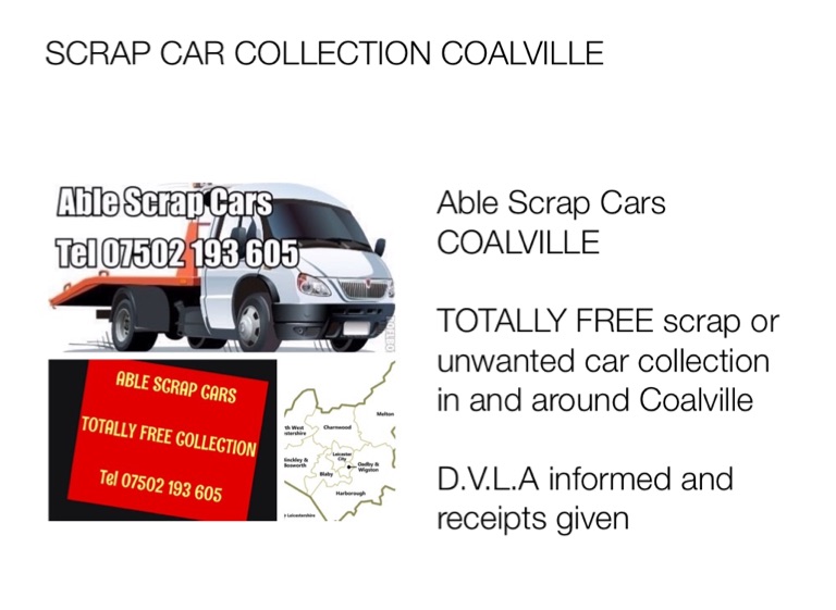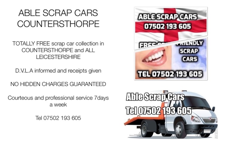 ABLE SCRAP CARS LEICESTERSHIRE Tel 07502 193 605 TOTALLY FREE scrap car collection and LEGAL DISPOSAL D.V.L.A informed and receipts given CASH paid for most vehicles Courteous and Professional service 7 days a week Call Paul 07502 193 605 NO HIDDEN ADMIN FEES GUARANTEED! (a lot of companies who advertise free collection will ask for an administration fee once they turn up at your home) WE DO NOT DO THIS! Where can i get my car scrapped in Leicester, Hinckley, Market Harborough, Lutterworth, Coalville, Loughborough, Markham, Stoney Stanton, Bosworth, Blaby, Wigston, Melton Mowbray, Enderby, Shepshed, ALL Leicestershire towns and villages Who takes scrap cars in Leicester, Hinckley, Market Harborough, Lutterworth, Coalville, Loughborough, Markham, Stoney Stanton, Bosworth, Blaby, Wigston, Melton Mowbray, Enderby, Shepshed, ALL Leicestershire towns and villages Where can i scrap my car in Leicester, Hinckley, Market Harborough, Lutterworth, Coalville, Loughborough, Markham, Stoney Stanton, Bosworth, Blaby, Wigston, Melton Mowbray, Enderby, Shepshed, ALL Leicestershire towns and villages Which is the best scrap car company in Leicester, Hinckley, Market Harborough, Lutterworth, Coalville, Loughborough, Markham, Stoney Stanton, Bosworth, Blaby, Wigston, Melton Mowbray, Enderby, Shepshed, ALL Leicestershire towns and villages Where is my nearest scrap car company in Leicester, Hinckley, Market Harborough, Lutterworth, Coalville, Loughborough, Markham, Stoney Stanton, Bosworth, Blaby, Wigston, Melton Mowbray, Enderby, Shepshed, ALL Leicestershire towns and villages Where can i get paid for my scrap/unwanted car in Leicester, Hinckley, Market Harborough, Lutterworth, Coalville, Loughborough, Markham, Stoney Stanton, Bosworth, Blaby, Wigston, Melton Mowbray, Enderby, Shepshed, ALL Leicestershire towns and villages How do i go about scrapping my car in Leicester, Hinckley, Market Harborough, Lutterworth, Coalville, Loughborough, Markham, Stoney Stanton, Bosworth, Blaby, Wigston, Melton Mowbray, Enderby, Shepshed, ALL Leicestershire towns and villages Able Scrap Cars 07502 193 605