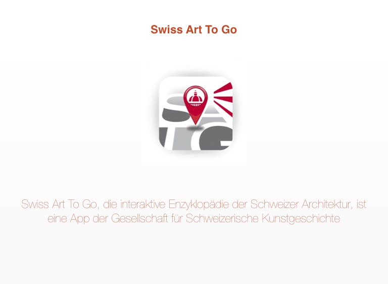Die Gesellschaft für Schweizerische Kunstgeschichte präsentiert ihre mobile App, Swiss Art To Go, die interaktive Enzyklopädie der schweizer Architektur. Diese App ist in App Store, Google Play und Windows Phone Store erhältlich.
