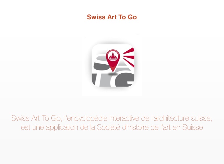La Société d’histoire de l’art en Suisse présente son application mobile Swiss Art To Go, l'encyclopédie interactive de l'architecture suisse. Cette application est disponible sur l'App Store, sur Google Play et sur le Windows Phone Store.