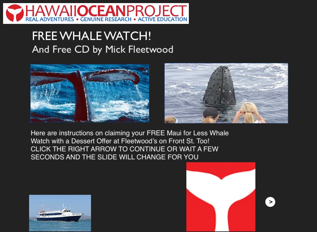 YOU MUST READ THIS AND FOLLOW THE INSTRUCTIONS TO GET YOUR FREE WHLE WATCHING CRUISE. CLICK ARROWS ON THE RIGHT EDGE OF EACH SLIDE TO ADVANCE TO NEXT FRAME. CLICK ON ITEMS ON EACH FRAME TO GET MORE INFO!