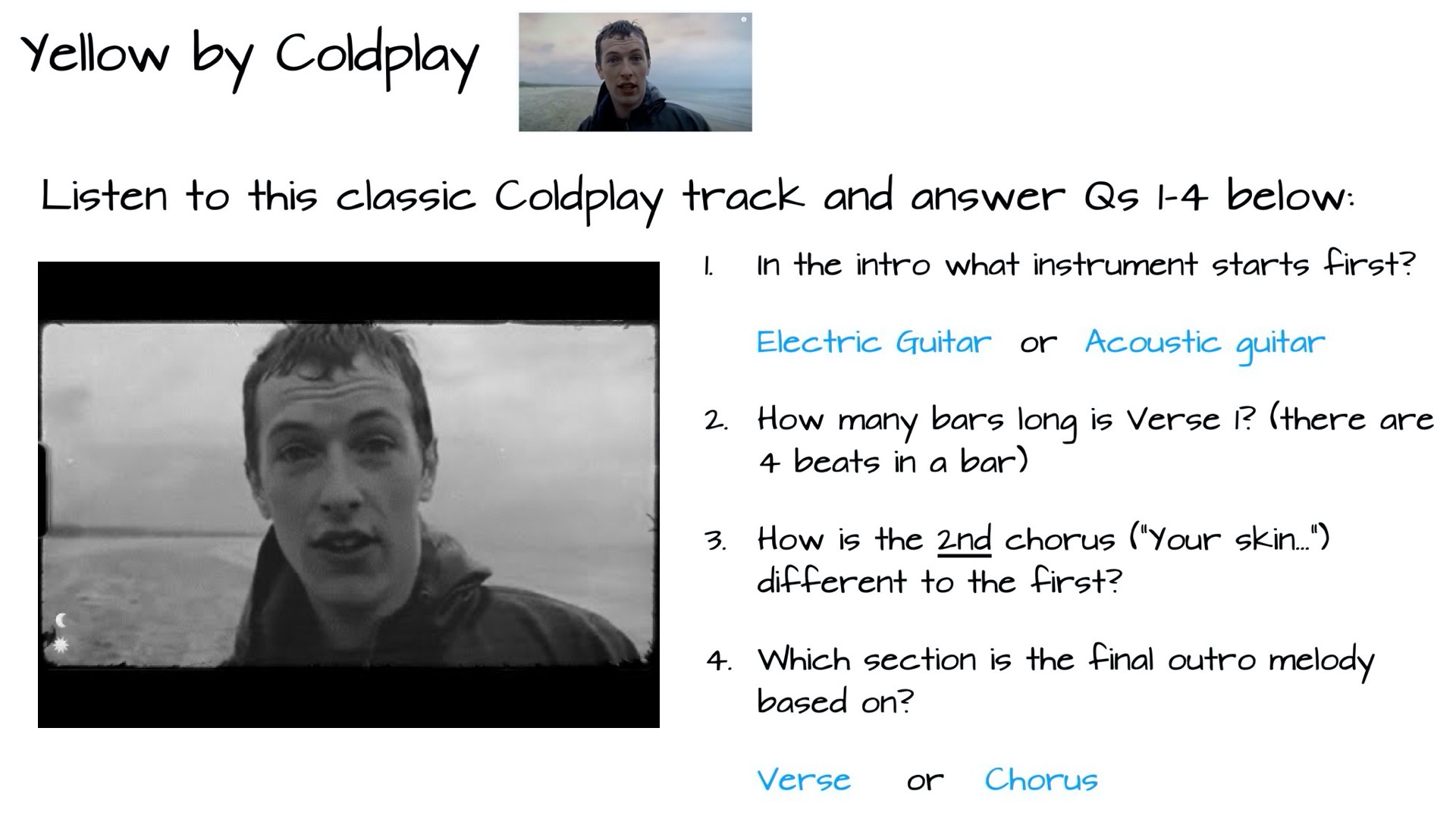 Lesson 1: 1. Listen to Yellow by Coldplay and answer simple questions 2. Do the vocal warmups (slide 2) 3. Learn to sing the verse and chorus melody (slide 3) 4. Watch the scrolling score and play the melody and bass on a keyboard or keyboard app Lesson 2: - Learn to sing the bridge and outro - Practice singing the vocal melody all the way through - Learn to play the bass all the way through on keyboard - Record at least one part all the way through: melody (played or sung) or bass - Try the bonus challenges in GarageBand (see final slides)