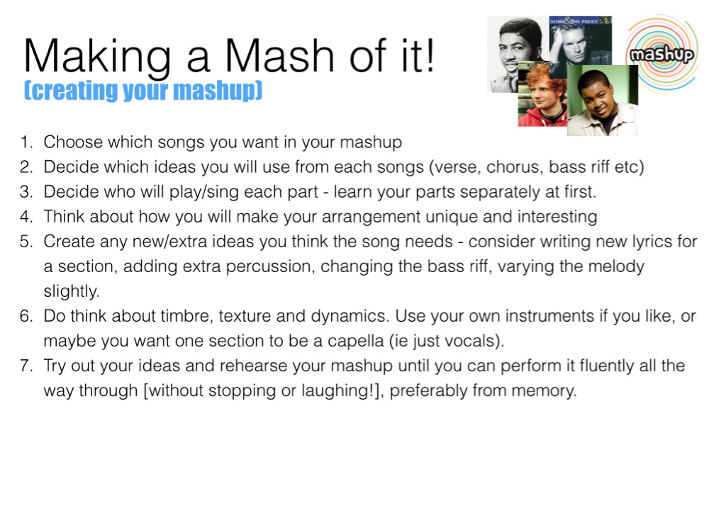 Year 9 Music topic, on Mashups. Students look at creating a mashup of at least two different pop songs, including Stand By Me. Video tutorials for bass and chords on keys and guitar are included.