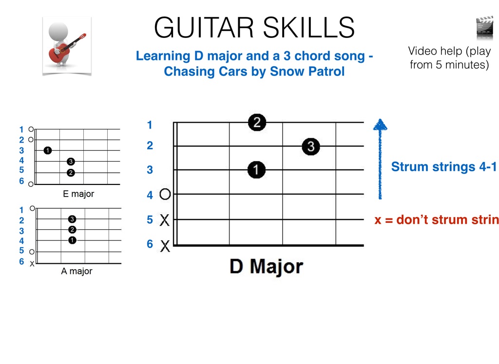 Guitar skills project aimed at Year 9 (UK), helping students learn 3 chords (E, A and D) and a fun riff higher up the fingerboard.