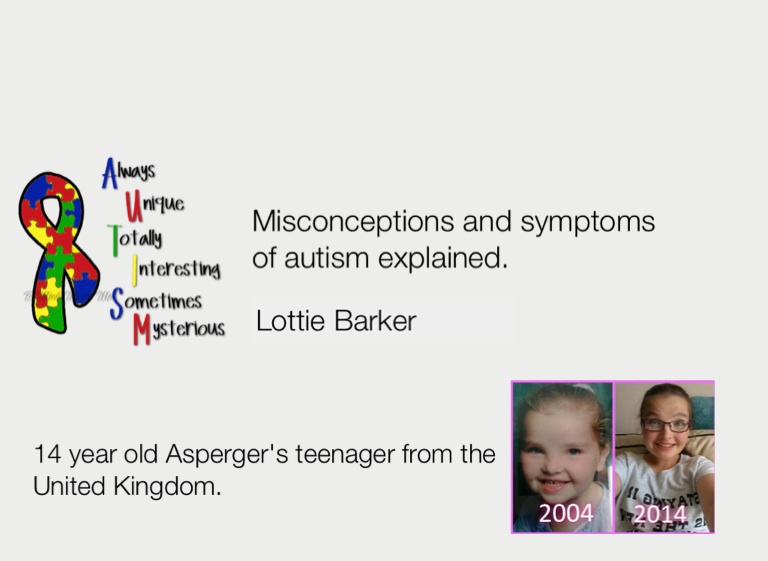 Hi, I have made this presentation after coming to the conclusion that not enough people know about autism. I also made this to help my teachers to understand me better and also understand my behaviour better. Although this is not overly descripted, there are websites at the end that you can visit. Please feel free to share, and help raise awareness of the real meaning of autism. Thank you:)