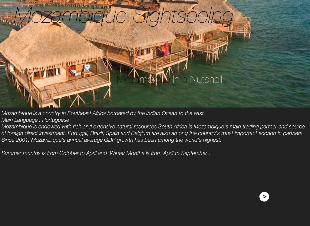In this Slides you will view information about Mozambique and the most attractive places out of many . This is a great Slide if you are going to visit Mozambique - or africa pass by Mozambique it will be wonderful , from the island to the highest peaks . Have fun :)